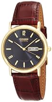 - Gold-tone-stainless-steel case; genuine brown leather strap with buckle; black dial; day and date function