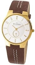 Stylish in brown. This men's watch features genuine brown leather straps and a slim stainless steel gold case. The layered silver white dial has gold indicators and hands with an extra touch of a small eye at the six hour with a second hand.