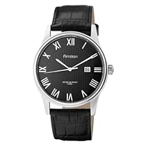 Round stainless steel caseBlack croco-grain leather strapTextured black dial with silver-tone roman numeralsDate window at 3 oclock sweeping second handWater resistant to 165 feet (50 M)