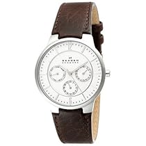 Slim and smooth. This men's watch features a slim vertically brushed stainless steel case connected to smooth genuine leather straps in brown pebble texture. The silver white dial houses multifunction with day date and 24-hour time. Indicators are chrome with white luminous features.