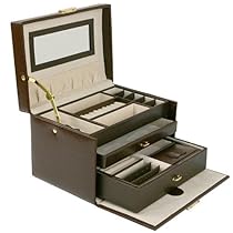 This classic Genuine Leather jewelry case or tote comes in a gorgeous coco brown textured Italian leather which is adorned with gold plated hardware. This Tech Swiss handcrafted case with multiple tray design will securely hold your most valuable pieces. With its brass lock and matching key you can rest assure that all your valuables are safe. The top tier of this tote features space for rings earrings cufflinks as well as other small jewelry items. This unique design gives each jewelry item an organized and convenient place to be stored. The top drawer pulls out for bracelets or necklaces as well as other additional jewelry items. The bottom deeper drawer pulls out for larger items and an additional matching compact travel case that fold up for carrying jewelry is also located in this drawer. The travel case can conveniently slip into a purse for everyday use. The jewelry box opens displaying a large rectangular mirror and a pocket for additional items to be placed. The lining of the case features a charming plush cream fabric which adds to the overall detail of the box. Dimension: L 9 1/2" x W 6 1/4" x H 6"