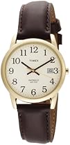 Dress watch Quartz movement Polished black hands and gold-tone sweep seconds Black Arabic numbers Black indices form surrounding minute track INDIGLO® night-light Analog date aperture at three o'clock Dark brown genuine leather strap with contrast stitching and polished gold-tone stainless steel buckle Polished gold-tone stainless steel round case Texured gold-tone steel crown Stainless steel caseback Mineral crystal Water resistant