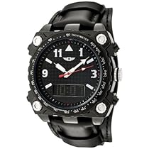Sporty appeal and high tech features the I By Invicta Men's Black Dial Black Leather Analog Digital Watch boasts both analog and digital displays. This watch's black textured analog dial (which features white Arabic and baton hour markers and silver-toned luminous hands) provides the setting for the watch's digital display which can be found at the analog dial's six o'clock position. The dial is surrounded by a black screw-down bezel with tachymeter information. Keeping all of this securely on your wrist is an attractive padded leather band that closes with a traditional buckle. Other features include reliable Japanese quartz movement water-resistance to 165 feet (50 meters) a stainless steel case and a mineral crystal.